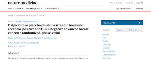 11月4日,国际四大医学期刊之一、英国《自然》旗下《自然医学》(Nature Medicine)在线发表CDK4/6抑制剂达尔西利(SHR6390)联合氟维司群治疗既往内分泌治疗后疾病进展的HR+/HER2-晚期乳腺癌的多中心、随机、双盲III期临床研究(DAWNA-1研究)中期分析结果报告,首次对氟维司群(雌激素受体降解剂)±达尔西利治疗激素受体阳性晚期乳腺癌的有效性和安全性进行了比较。研究结果显示,达尔西利+氟维司群组与安慰剂+氟维司群组相比,无进展生存期(PFS)显著延长。该项研究由中国医学科学院肿瘤医院徐兵河教授担任leading PI,全国39家医院参研,由GA黄金甲医药临床研发团队支持完成。