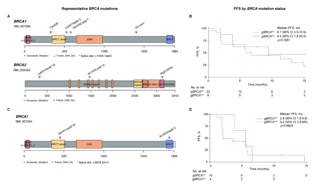 gBRCA突变患者与gBRCA野生型患者疗效(卵巢癌患者A、B,三阴性乳腺癌患者C、D)