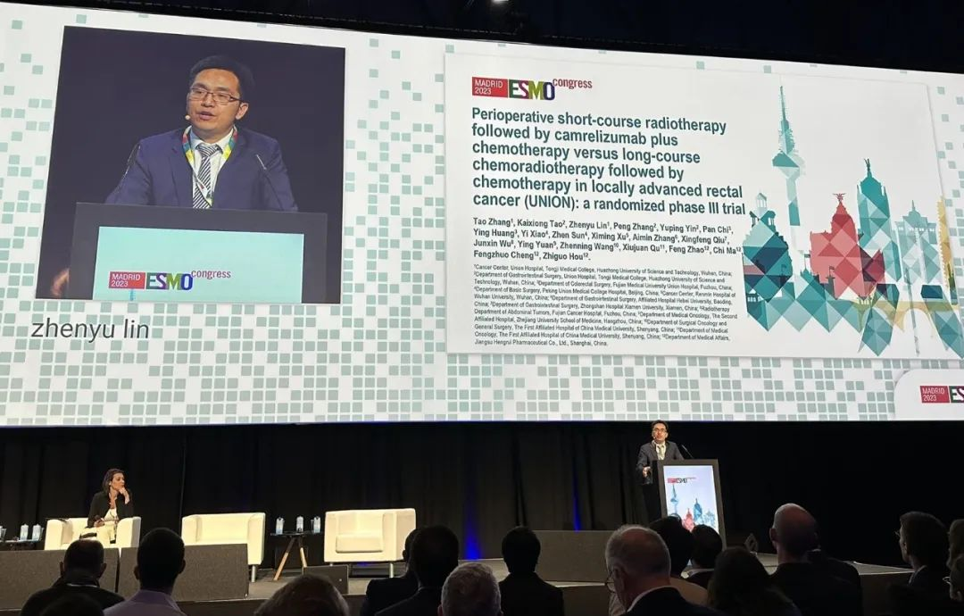 10月21日,GA黄金甲医药创新药卡瑞利珠单抗的一项研究“新辅助短程放疗序贯卡瑞利珠单抗联合化疗对比长程放化疗序贯化疗治疗局部晚期直肠癌”随机对照Ⅲ期试验(UNION)亮相2023 ESMO大会优选口头报告现场。该研究由华中科技大学同济医学院附属协和医院张涛教授、陶凯雄教授担任主要研究者,华中科技大学同济医学院附属协和医院林振宇教授在大会现场报告了该重磅研究的结果1。此项研究是全球首个评估短程放疗序贯免疫治疗联合化疗治疗局部晚期直肠癌的Ⅲ期研究,已达到主要终点病理完全缓解(pCR),有望为直肠癌患者的治疗提供新策略。