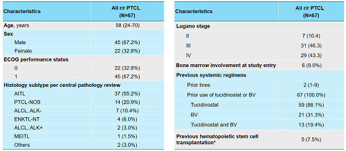 研究共纳入67例患者接受SHR2554治疗,包括37例(55.2%)血管免疫母细胞性T细胞淋巴瘤(AITL),14例(20.9%)PTCL-NOS,7例(10.4%)间变性淋巴瘤激酶阴性的间变性大细胞淋巴瘤(ALCL,ALK-),4例(6.0%)结外NK/T淋巴细胞淋巴瘤鼻型(ENKTL-NT),2例(3.0%)ALCL-ALK阳性(ALCL,ALK+),1例(1.5%)单形性嗜上皮性肠道T细胞淋巴瘤(MEITL),2例(3.0%)其他亚型。既往中位治疗线数为2(范围,1-9)。所有患者既往均接受过化疗方案;此外,所有患者均接受过西达本胺或维布妥昔单抗治疗(西达本胺,59[88.1%];维布妥昔单抗,21[31.3%];同时接受过两种药物治疗,13[19.4%])。