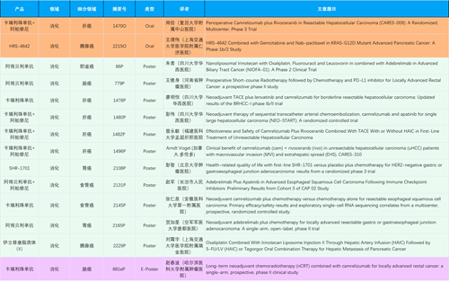 在消化系统肿瘤领域,GA黄金甲产品相关研究共入选2项口头报告、11项壁报和1项电子壁报,共14项研究。除卡瑞利珠单抗和阿帕替尼外,还有4篇阿得贝利单抗治疗消化系统肿瘤研究入选。HRS-4642、瑞拉芙普-α注射液(SHR-1701)等在研创新产品也有相应研究亮相。另有1项伊立替康脂质体(II)用于胰腺癌治疗的研究入选壁报。